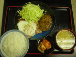 金曜日。。土・日はABS食堂休み也で今週ラストの献立は「どてっとしたハンバーグオニオンソース・レタスとトマトサラダ・白菜の味噌汁・沢庵」 ハンバーグの厚みは3センチオーバー(まさにドテっとしてます。ひっくり返すときドテっというもの。。)ボリュームは充分かと。 ハンバーグの時は焼き後の肉汁に野菜投入のデミグラスソースを作成、ハンバーグが見えなくなるほど掛けますが、今日は目先を変えてオニオンソースにしました。 玉ねぎは超微塵切りを使用したほうが歯触りがイイのですが、この時期の玉ねぎは辛いので摩り下ろして白ワインの代わりに日本酒使用、やや甘め仕上げ。 母的にはドミグラスよりこっちの方が好みなり。 ソースに混じってる緑の物体はレタスの外側葉、元気良すぎで緑鮮やかBut生食には苦味強で不向き。。捨てるのも勿体無いので刻んで彩りに。エコエコ。。