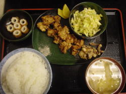 「鶏カラ・イカゲソカラ・新キャべ甘酢合え・竹輪・沢庵・白菜の味噌汁」 鶏モモはニンニク醤油と酒に漬け込んで粉まぶしで揚げ。 イカゲソは香辛料混入粉まぶしで揚げ。 キャべは千切り唐辛子で軽めのパンチを効かした程度で酢はかなり控えたのですがN爺はむせてました。。母もバカい頃、、もとい若い頃は酢が苦手でしたが最近旨いなー喰いてーとか思う日が有り。お疲れの時には回復にとてもヨロシなのにネー(化学的にも!)。子供には解せんか?