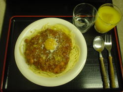 本日のメニュー「スパゲティ目玉ミートソース・オレンジジュース」 特売で買い込んだ挽肉が。。でも先日ハンバーグだったしーー。。 御飯に合う挽肉料理なぁ。。。 パスタ?米に拘らんでもヨカよねー んでコレ。挽肉、人参、玉ねぎ、セロリ、トマト、バジル、オレガノ。。仕上げは生卵落しのパルメザンチーズ!でも何故かポークビッツ(ウインナー)混入。。N爺とハミル豚は世間的には30も超えて立派なオッサンなんだろーけど、母的にはプラス子供用を考えてしまいます。。サラダを作るのが手間だったのでオレンジジュースってのもお子様っぽいけど、旗は立ってないので「お子様ランチ」ではありません。
