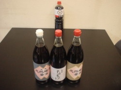 Yっきー来店っ!画のブツ。頂きました! イデタチからしてヤンゴトナキ。。かな。濃い.薄・たまりのトリオ。普段のABSランチに使えねーよな。勿体無い。スペシャル用に置いておこうーっと。(もしくは、スタッフぅ〜に内緒の食材用とか。。) だってねー、旨すぎなモン摂取すると落とせなくなるでしょ!そげな事態になったらエンゲル係数上がりぱなになるじゃんっ!! 画像の後方に肩身狭めに写ってますのは、母が先日レジに2回並んでGETした○金醤油です。。(お一人様1本の特売だ!) 大豆が高騰中でやたら値上げの中の特売っ 母は燃えた!燃え尽きた。。 ひがむな!○金っ!御前は優秀なソルジャーだっ ABSランチ和風バージョンに欠かせない重要任務が待ってるぞーー