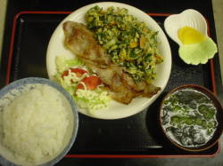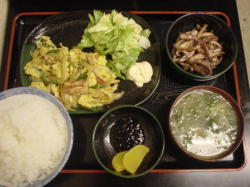 Tみさんが久しぶりに御来店。アチコチでアップされてるユーロ動画に、めちゃオモロかったみたいやなぁーーと参加出来なったを悔しがっておりました。。当日Tみさんは御親族の結婚式に御出席でした。披露宴で旨いもんタラフクお召し上がりでしょう?のハズがもっぱらカメラマンさせられたそう。。お疲れ様。。一緒に昼飯喰うべ。。「ニラ玉/豚ロースのカリカリ焼き/プチサラダ/ワカメと葱の中華スープ」 ニラが特売でした!ので玉ねぎ、にんじん加えてドッサリ使用。明日のお通じは◎確定。 豚ロースの薄切りのやや厚切り(どっちやねんっ)にガーリックパウダー、塩コショウ、軽めに小麦粉で化粧したものをカリカリの手前(どっちやねんっ)に焼。簡単な割りにイケルと母的見解。お試しあれ。マジ3分クッキングだぜ。ビールにも合うぞー。