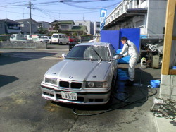 O山氏、開店同時に洗車においでで。。えらい奴っちゃなぁ〜〜と感心しておりましたのに、終わったし帰るでぃ。早っ。。ワックス掛けたん?と問いましたらーーM田が後で来るからって帰ってゆきました。。そして、殆ど入れ違いな感じでM田君登場。いつもはスーツ姿なのに作業服。WAX掛けに来たのね。。がんばれ。 数分後の画像。黙々とやってます!えらい!隅々まで。。 こんなけツルツルピカピカにしたら。。 1秒は稼げたねっO山様!