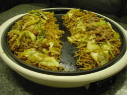 「モーゼの奇跡」の如く、、あれは海が割れるのね。。恵比寿では焼ソバが割れます。N爺とハミル豚の境界線を作ってみました。3.5玉/1人前です。 (髭と母は別フライパンで3玉を2人で分けます) 具材は至ってノーマル、豚、イカ、キャベツ、ネギ、青海苔。 量がハンパないのでフライパンで野菜だけ、肉・イカだけ、3玉、3玉、4玉と分けて調理したものを後で合体させますのよ〜 デカ鍋を幾度も振るので母の腕は日々、たくましく鍛えられてます。。