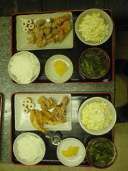 昨日「記録的短時間大雨情報」とやらがTV画面の上っちょに速報で出た。初めて見たぞ。それもそのはず、数年(100年とか?)に一度程度の情報とか。。。母がババァつうても生まれて半世紀にも及ばぬ、当然じゃ。。朝方のピーカンが俄かに黒雲立ち込め、普段の夕立様相とは違ってたもん。天変地異?コレも温暖化の影響ですか?暫し悩めど、、、、、日々の生活メイン、腹も減る、、で典型的小市民、本日のランチ。 上段若者用★鶏モモと手羽元の唐揚げ和風=カツオ出汁と日本酒、醤油で下味に片栗粉でカラッとあっさり。 ★竹輪 ★炒り卵とキャベ千のレモンマヨサラダ ★ワカメの味噌汁 下段年寄り用★鶏唐揚げ少量に木端フグの唐揚げ・・以下同文
