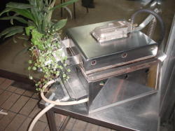 恵比寿エントランスに鎮座してます、この物体。観葉植物で誤魔化せど関西人は一目瞭然、イカ焼機なり〜。なして?、、とお思いでしょ!ずばりっ!!イカ焼プロジェクトです。恵比寿タコ焼は既にユーロでご好評を頂いておりますんで調子に乗ってみようと。。(実は随分前にイカ焼屋さんから新同購入、お蔵入り) たこ焼が好評=粉モン好き=イカ焼プロジェクト発足。 倉庫にしまい込んでたのを穿り、磨き上げ、テスト焼の段でガスのバルブ口径がーーー。元栓の変換を頼まにゃーと時が過ぎ、イカ釣り船がストライキだ!のニュースでテンション、ぐっと↓。。マジ、市場にイカがおらんでぇ(冷凍は未だおるけど)シーズンなのにビックリ高値。。恐るべし原油高騰波及。。そんなこんなで、すっかりオブジェと化してます。金属の鈍い光沢と重厚感、少しメカニカルでオブジェとしては合格かと存じますぅ〜〜!って嘘だよ。バルブ交換次第、試作するのでヨロシク。 ユーロ賄いに登場するは遠からじ。。。な予定(は未定)