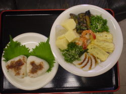 恵比寿のキッチンはゲロ暑い。元々台所で無くて給湯室。お茶をいれる程度の狭さなんだから仕方ないわ。。調理の度汗みずく。今日は冷たい献立にしよう!と考えたんだけど、ご飯炊いたり、野菜炒めたり、海老茹でたり、、で結局暑いに変わりなし!食する時が冷たいだけだ。。と後で気付く暑さボケの母でした。。 ★冷ぶっかけウドン=茹で海老、ナスとシメジの煮浸し刻みシソ掛け、出汁巻玉子、カマボコ、玉子豆腐をトッピング。刻みネギと切りゴマ。直前に焼き海苔とつゆをかけていただきまーす。海苔は邪魔くさがらず、炙るべし。 ★梅干まぶしオニギリ=大葉でくるんで食う。さっぱりと美味いぞ
