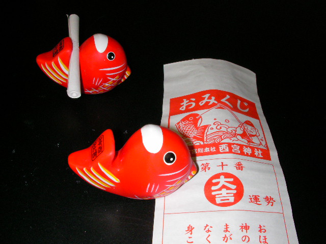 茨木神社に初詣、10日後に再度えべっさん参りに茨木神社。。を繰り返してますが、ラジオで「鯛のおみくじがカワイイ」と聴き付けて名神一っ走り西宮神社へ詣でた2011元日。素焼きに絵付けを施された鯛がおみくじを抱いてビッシリ並んでます中より1個チョイス。母は大吉どした。髭は末吉とまずまずか。鯛は置物にペーパーウエイトに箸置きに使えるぞ。毎正月あるらしいので皆様も参られては?