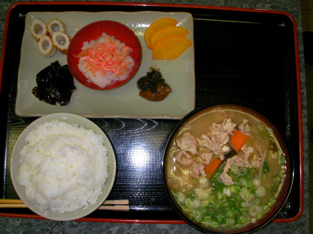 寒い日にはコレ!、、はOKだけど御飯の友が淋しいか。。★具たっぷり食べる豚汁 ★松茸昆布・竹輪・沢庵・梅干・大根オロシ