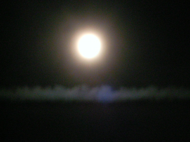 フルムーンと飛行機雲のコラボ。 お月さん、おぼろ。