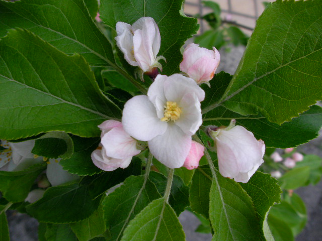 リンコ開花。 ♪り~ンゴの花、ほころびぃ川面に霞たちー♪ が頭に浮かぶか? ♪りん、ごぉおお~の花びらがぁ~、風にぃ ちぃったとさぁ~~♪ がよぎるか? は自由だ!