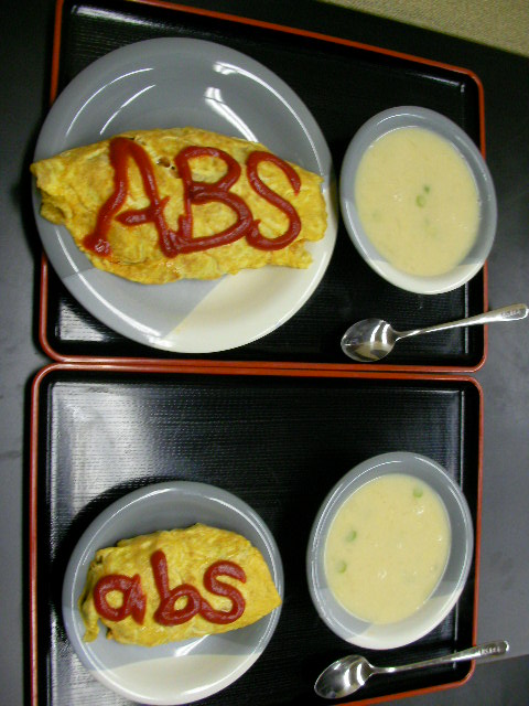 今日は半分がセントラル組でキャパ少なめ。ご飯を炊かずに残り冷ご飯で ★オムライス=鶏ミンチ・玉ねぎ・人参・インゲン。野菜タップリ。デカイのは大文字ケチャップ。チンコイのは小文字ケチャップ。暇人。。 ★キャベツとインゲンのポタージュスープ=キャベツの芯(ゴミ?言うな!)をマーガリンで炒めて小麦粉塗して牛乳でのばす。水で増してコンソメかブイヨンのキューブをぽちゃん。ひと煮立ち。塩コショウで味整え、色みが淋しい(キャベツの芯なもんで...)のでインゲンの刻み入れとこ