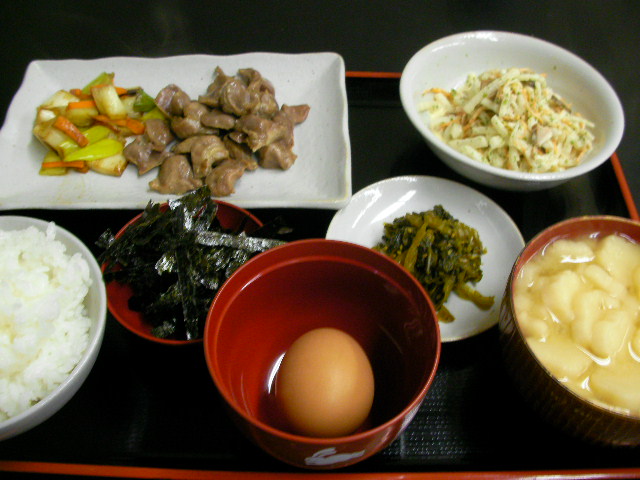 砂ズリと大根のサラダ。まるで一杯飲み屋的献立。生中3杯いけるね。せめて御飯の友に生玉子付けとくか。。 ★砂ズリ白葱炒め添え=コリコリ歯ごたえが美味いけど、下ごしらえ面倒な食い物だ。削ぐように皮やら膜やら外して洗って拭いて酒塗して、、あ゛~邪魔くせー しかも要らぬトコ外したらカサ減るし。。。(--; ★大根サラダ=大根軸切り。人参千切り。どっちも塩してシンナリしたら絞ってマスタード・マヨ・酢・塩コショウ。アオサと先日の残りのカツオ生節刻んでザックリ合えて完成。いつもはツナ缶。ビックリするくらい大根摂取出来るよー ★玉子かけ ★高菜漬とモミ海苔 ★麸たっぷり味噌汁