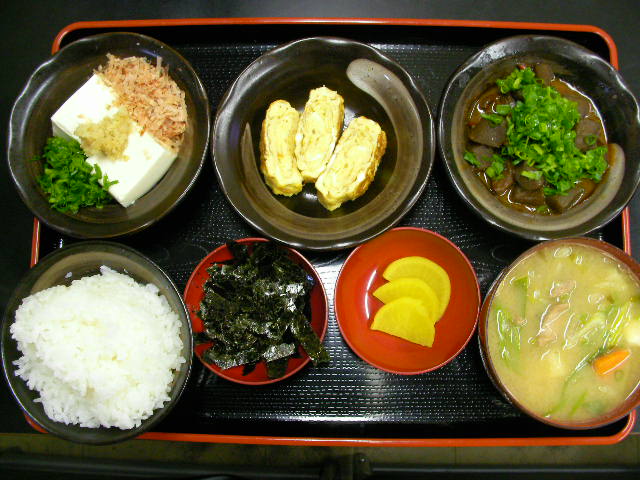 本日シェルポさん定休日なんでこじんまり。。以前より「・・?」な冷奴を温奴に変換実験を試みる!冷奴を冬に食うて何か?と豪語したが寒さもホンチャンになると有り得ん。 んで前より思ってた冷奴を暖っかバージョンにしたら、、どんな?? 湯豆腐にしたらエエやん!なんて普通の事、言うな!あくまでも冷奴を温奴に置換するのが本日の大義なのじゃーー 言うても簡単。 冷奴の具材:刻みネギ・オロシショウガ・鰹節。 豆腐をレンジでチンする。スが入らんよう再度チン。当然、水が出るので捨てて薬味トッピング。後は冷奴に同じ。醤油ぶっかけて頂く。イケルで~~ 実験成功!やね。 ★温奴 ★玉子焼き ★土手焼き ★海苔&タクアン ★とん汁