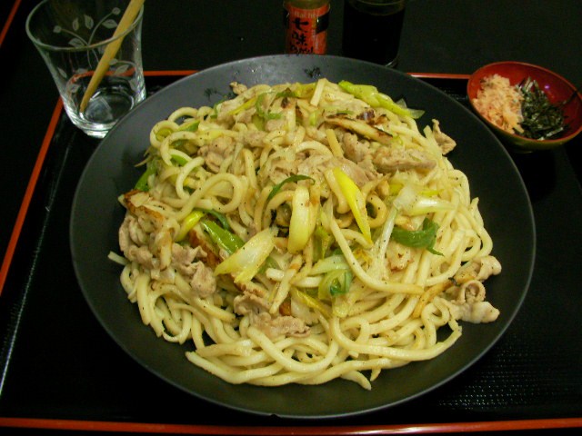 焼きうどん。醤油味か?ソース味か?当然、前者。キッパリっ 焼きソバはソース味。これもキッパリっ ヒゲは流行りの塩焼きソバに興味しんしんみたいだが、断固拒否。食いたかったら新しい嫁を貰え。。。 ★焼きうどん・ダシショウユ味=豚・チクワ・ネギ。食する時に刻み海苔と鰹節をトッピング。お一人様3玉使用で白御飯なくても夜までもつやろ。。多分。。
