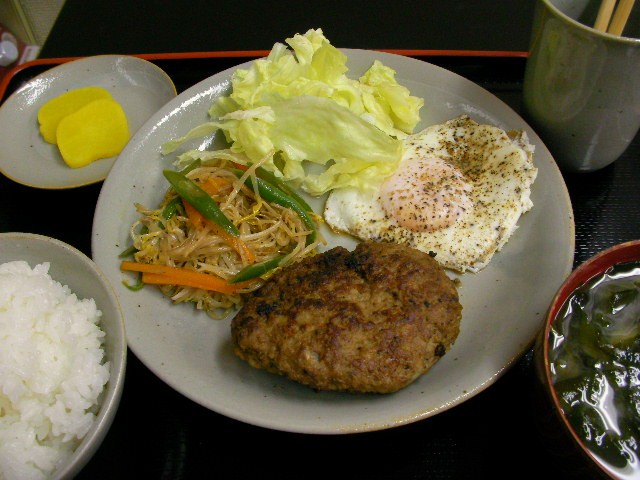 先日のデカバーグを作った際に作りおきの並みサイズな並みバーグ。径は縮小されたが厚みはやっぱり2~3センチだぞ ★並みバーグ=野菜ソテーの汁を流用した甘辛醤油ソースorケチャップ、どっちで食べるかは自由だ ★モヤシと人参、インゲンのソテー ★目玉焼き ★ワカメどっさり味噌汁