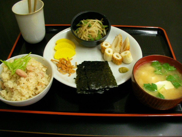 久しぶりに炊き込みご飯。ヒゲは白ご飯は小の割の割り=大さじ3杯程度しか食べないが、なぜかかやく御飯は大盛り。ガキやね。。多めに炊いとこ。。 ★鶏ゴボウごはん=皮をむいて適当な大きさにカットした鶏モモに酒・塩。休憩 ゴボウ、人参、笹掻きのコマ切れ。ショウガ千切り。 洗い米に水・酒・出汁・ショウガの千切りを入れて待機。 休憩中の鶏肉・ゴボウ・人参を炒めて塩とダシ醤油で味付け。コレを待機中の米に合体して、後は炊くだけ ★鶏皮カリカリ七味焼き=ひん剥いた鶏皮を捨てずに千切り。油をひかずに弱火でカリカリまで焼いて塩と七味パラパラ ★チクワ ★焼き海苔=強火の遠火で炙るべし ★モヤシとインゲンの胡麻和え ★豆腐と三つ葉の葉っぱ味噌汁 三つ葉の軸は何処?でしょ?塩ゆでしておいて炊き込み御飯が炊き上がったら混ぜるのさ! 一緒に炊き込んだら色が翔んじゃうからねーー