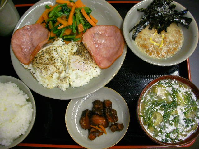 ニンニクって野菜なのに凄いっ お肉にコクやら風味は当然やけど、野菜にもコクが出るもんねー。野菜が高過ぎ!とぼやいて3ヵ月程、未だに高いで。。 特売でドサッと買い込んだ人参と貴重なホウレン草を美味しく頂く為にニンニク1玉使ってみた ★ホウレン草と人参のガーリックソテー=邪魔くさいけどホウレン草の茎部は軽く塩茹で。ニンニクはスライスして火の着いてないフライパンに乗っけ、オリーブオイル掛けて弱火着火。低温でジックリ抽出がキモね。決して熱したフライパンを使うべからず。中火で人参ジックリ焼いて強火でホウレン草の葉っぱ投入、茹でた茎部投入、塩胡椒、コンソメパウダー隠し味で立派な1品。 ★ハムエッグ ★納豆with海苔 ★炒め水菜と薄揚げの味噌汁=水菜も手間惜しまずザッと炒めると味噌汁にもコクが。。 ★キューちゃんのバチモン