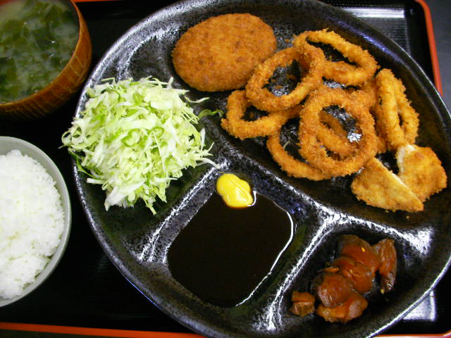 イカリング。。確かに販売してますけどぉ、、食べる方ね ★イカリングフライ=イカはエンペラ(三角のヒラヒラ)と足と胴の3パーツに解体。本日は胴部使用。エンペラとゲソは冷凍庫に保存して別料理に。。 ★カレーコロッケ=カサ増し用の揚げるだけ冷凍モン ★ササミフライ=コイツは試作品。(卵液とパン粉が微妙に余ったもんで。。)ササミは天ぷらばっかなんで試してみた。。やっぱササミは天ぷらがイイね。柔くてたよん無いし、ソースにイマイチかな。チーズやら野菜やらロールしたら話は別だけど邪魔くせぇ。まんまじゃチキンカツと大差無いし。。不採用決定 ★(貴重な)春キャベ千 ★キューちゃんモドキ ★ワカメ味噌汁