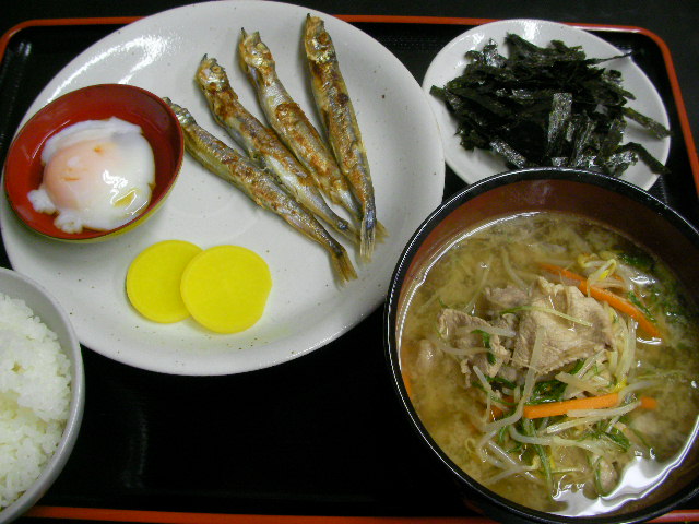 特売だったのでシャブシャブ用豚ロースを買ったのだけどぉ昼間から皆で卓を囲んでる間も無いので・・・★食べる味噌汁=ベースの味噌汁を作って豚ロースしゃぶしゃぶ。モヤシ・水菜・ゴボウ・ニンジンを炒めたの合体。すりゴマどっさり、タップリ入れて、濁りが味噌なのか?すりゴマなのか?もはや不明。デカ椀で呈して汁、兼オカズ。 ★シシャモ炙り焼き ★温玉 ★味付もみ海苔