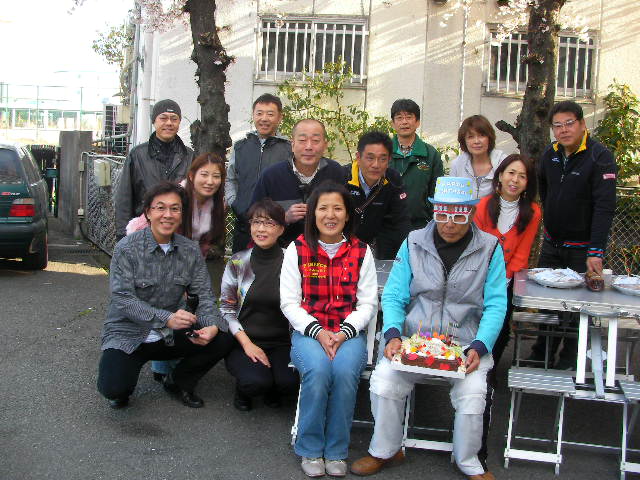 主旨が兼お花見なので寒いけど桜の木の下で集合写真。ケーキ落としらアカンで!とやいやい言ったので固まっちまったMr.ギーマ