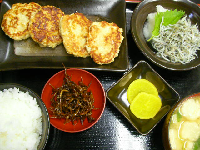 「豆腐バーグ」ちゅうてますけど「豆腐のおやき」やね。ダイエットに向いてると思います。 ★豆腐バーグ=前日にザルにあげて置いて水切りした木綿豆腐をモミ崩して鶏ミンチ・すりゴマ・卵・塩・鰹節・めんつゆ少々・塩少々で捏ねてコンガリ焼いて1丁上がり。ツナギが豆腐なんでヘルシーだぜ ★イカナゴ釜あげの大根おろし ★イカナゴ釘煮 ★三つ葉と麸の味噌汁