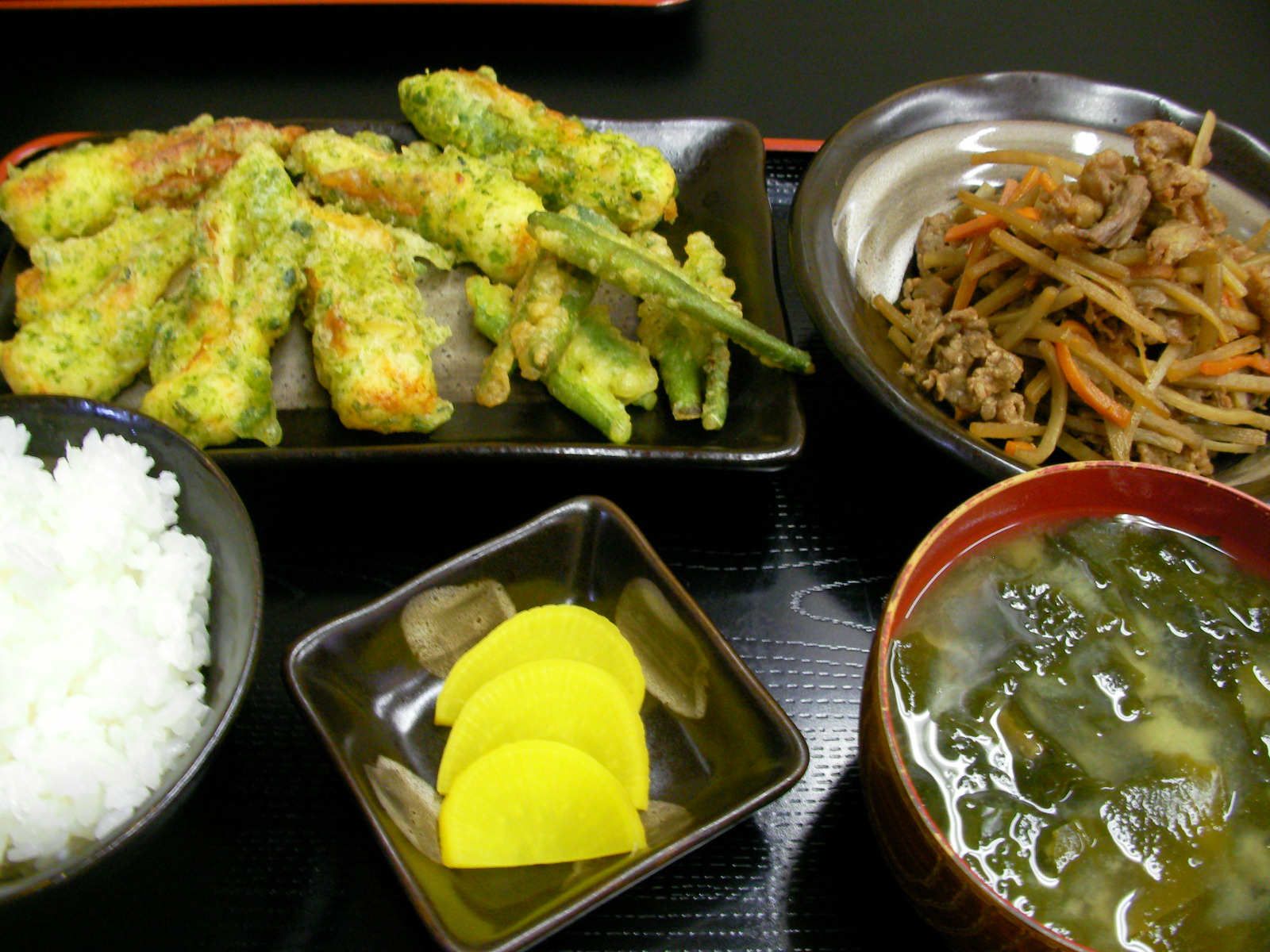 きんぴらって何できんぴらなんだろ?と常常思ってたけど、どーでもいーよーな。。半世紀ほども生きて探った試し無し。しかし往生のキワにキンピラってなんで?と脳裏に浮かぶのもヤなんでウィキってみましたー。便利な時代。図書館で半日過ごす必要なし。。 ★牛きんぴら=牛コマを混入するだけで牛脂のコクも加わり、御飯がススム君に変身だ~ゆえに御飯、多めに炊いときましたっ ★チクワの磯辺揚げ・インゲン天添え