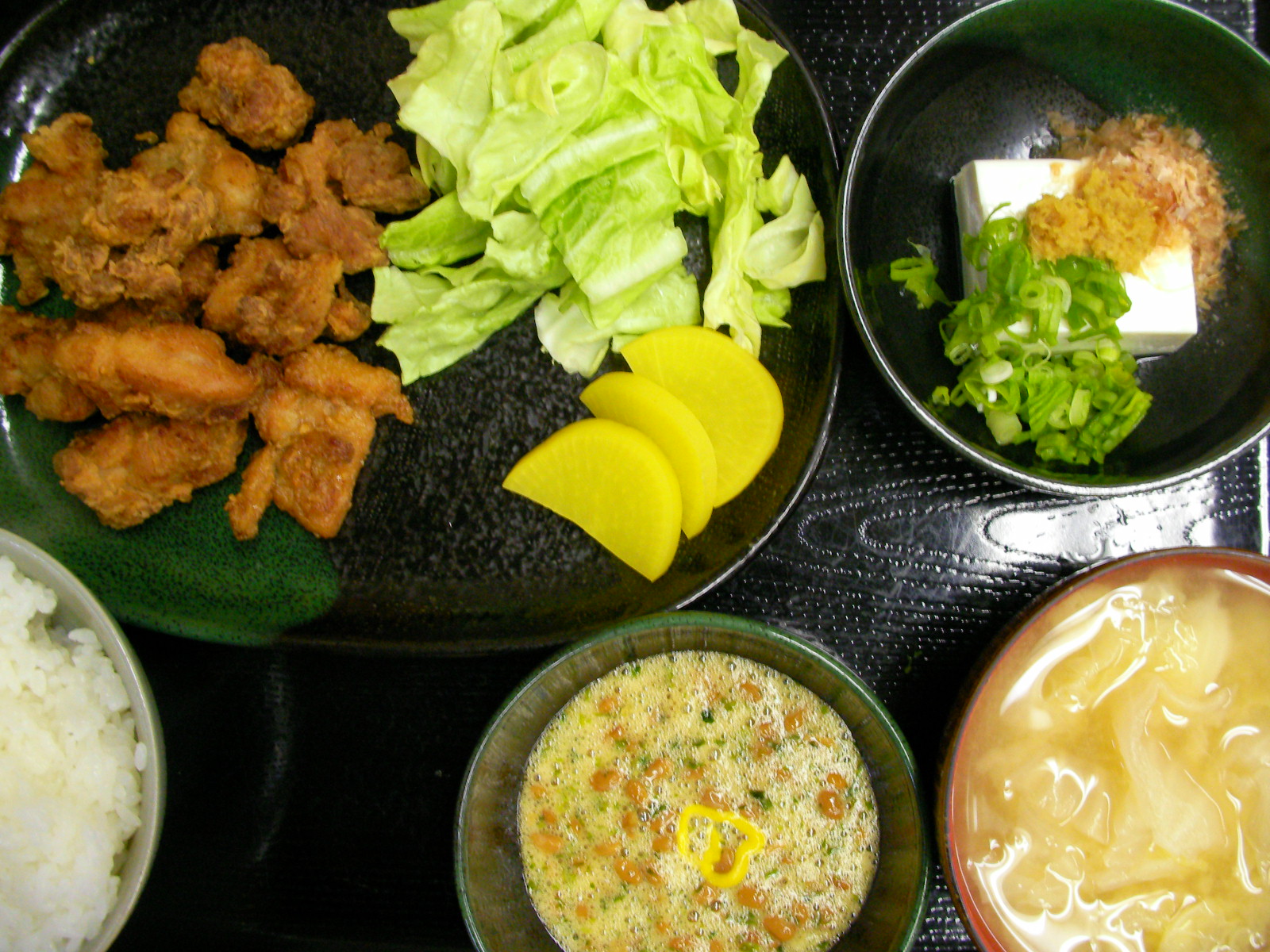 鶏カラって表面だけ味付きで中が頼ん無くて塩胡椒付け付け食すの多くね?朝・昼に調理なら前夜仕込みがラクチンな上、味付けシッカリ、御飯に合うぞ。(ビールにも合うぞ~~)★鶏モモ唐揚げ=塩・酒・醤油・etcに漬け込んで冷蔵庫で放置を小麦粉塗して2度揚げするだけ。忙しい時に時短も兼ねてブラボー。新キャベざく切り添えとこ ★冷奴 ★卵とアオサ混ぜ納豆 ★白菜の味噌汁