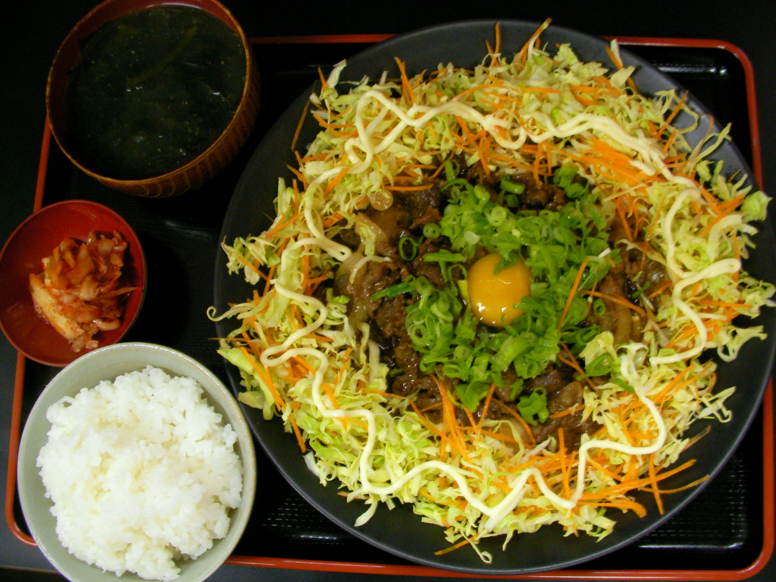 プルコギなのか、、サラダなのか、、両方とって★プルコギサラダ!ってことで。。焼肉のタレを揉みこんで焼いた牛切り落とし・同じくタレで仕上げた新玉炒めを盛って生玉子とネギをトッピング。新キャベと人参の千切りを周囲に。ごちゃ混ぜで食せば焼きタレでキャベもドレッシング要らず。 ★ワカメと切りゴマのスープ ★辛くないキムチ
