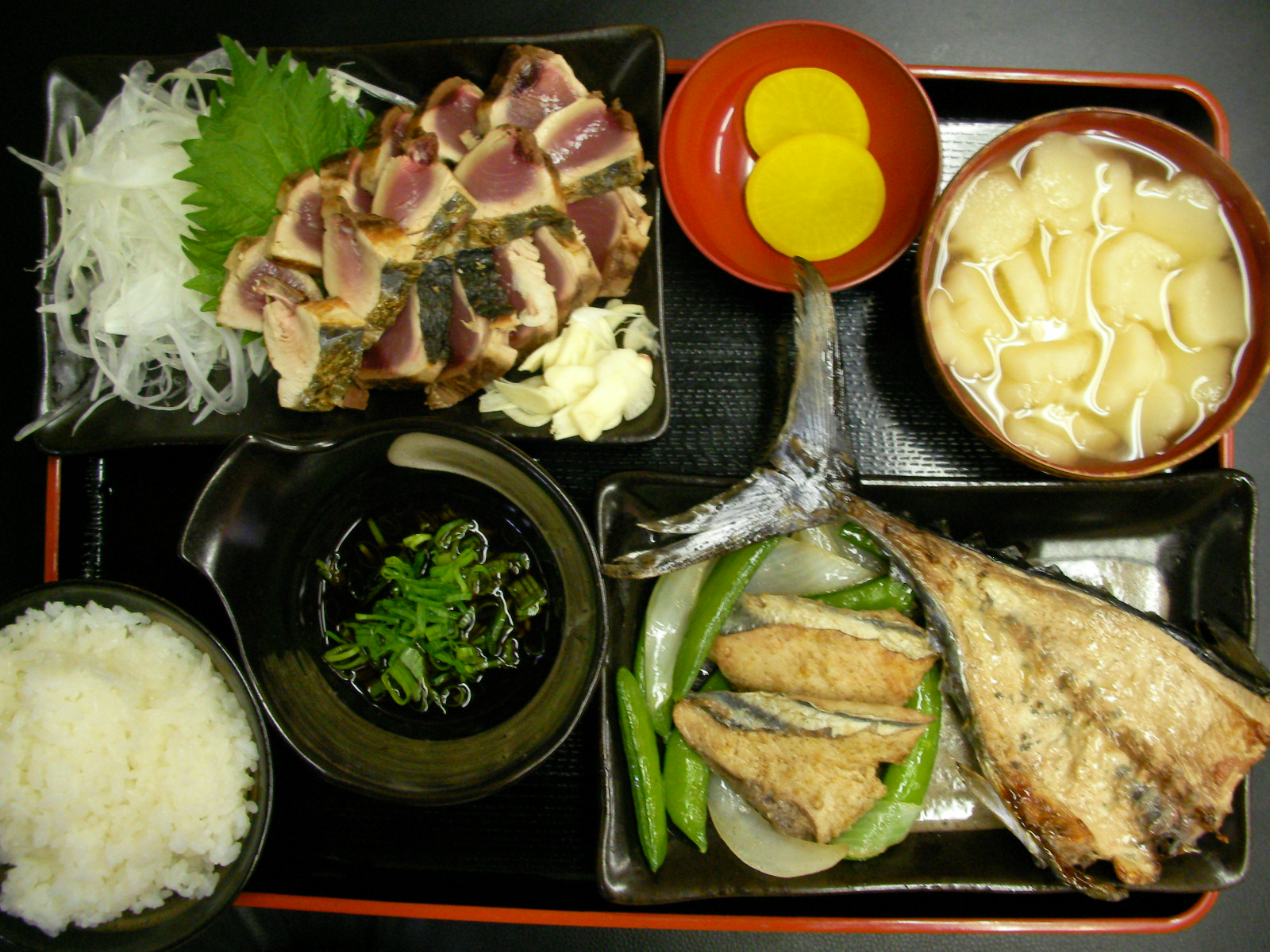 カツオは背やエラビレの下部に甲冑みたいなウロコ的なモンがあるのでさばく予定のある諸兄はご注意を。さて3枚に下ろしたサクを★タタキ=新玉のスライスとニンニクのスライス添えてポン酢 ★塩胡椒焼き=サクを削ぎ切りにしたのに塩胡椒、オリーブオイル焼き。アラ骨も同じく。新玉ザク切りと、サッと塩ゆでしたスナップエンドウ炒め添え ★麸の味噌汁