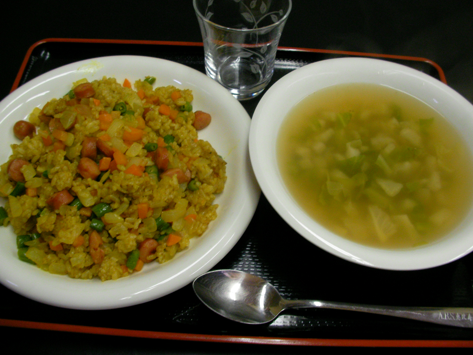 母とヒゲはシッカリ観ましたでー。定休日でありましたが悲しいかな、朝寝坊出来ない歳で7:30AMなんてオチャノコサイサイ。観測メガネの用意はしてなかったので幻影法で?・・一瞬お日樣を観る・壁を見て瞬き。。網膜に残った残像を見る・・を繰り返し。 眼へのダメージが如何かは知る由無し。。 さて、今日のABSランチ。残りご飯の利用がオムライスばっかだったので豊富な新タマをタップリ使って★カレーチャーハン たまってきたキャベツの芯と外葉で★キャベツのコンソメスープ