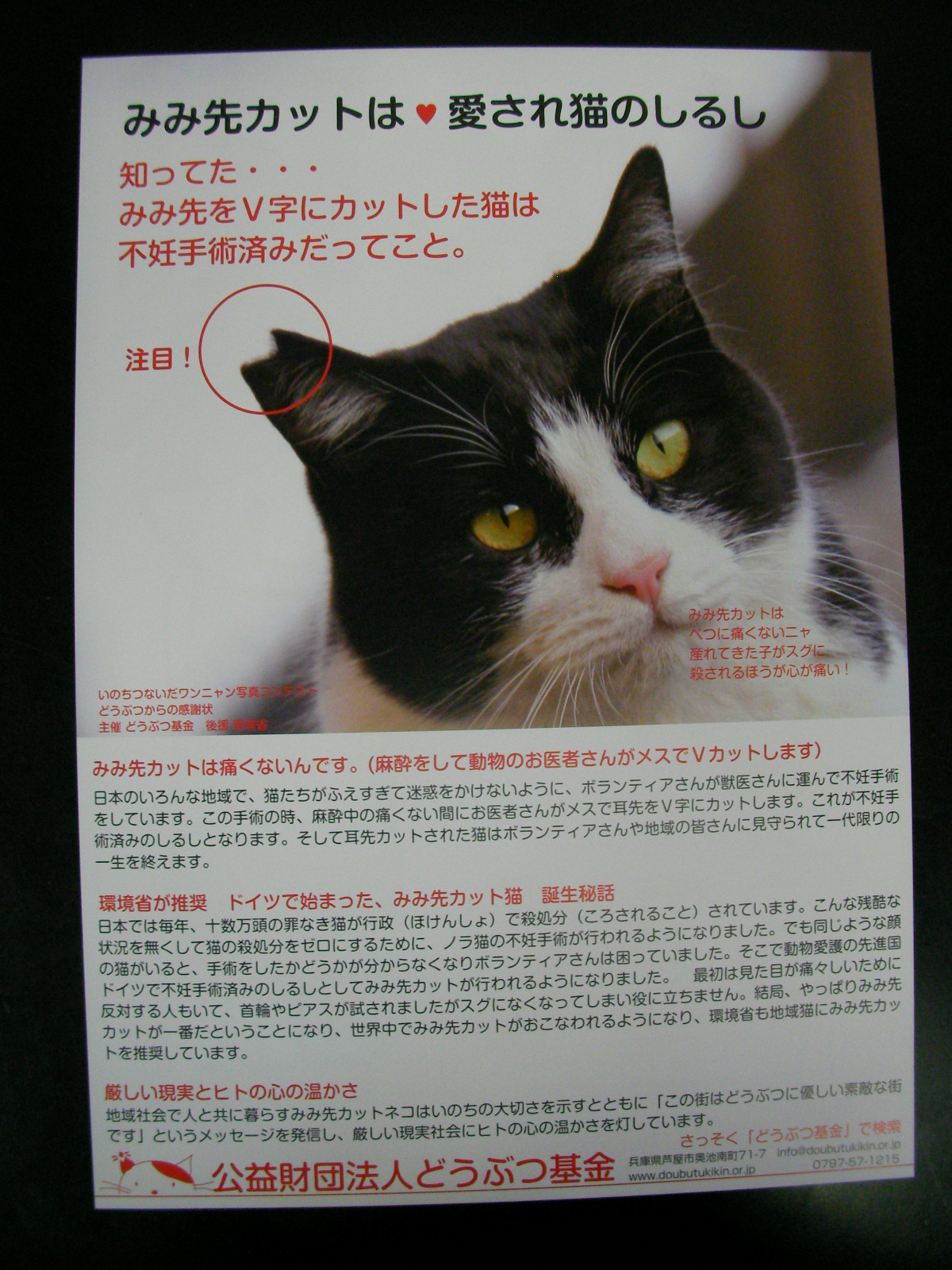 コレも掲示中なんで読んで下さったかも。。 殺処分を無くすには1に避妊。4も5も無く避妊。ニャンコやワンコはコンドーム使いませんからっ! 避妊をすれば子猫が増えずノラさんは1代限りの命を全う出来る!(ノラは飼ってあげたくても凶暴な奴もおるんです。。)なら、猫ババァ&ジジィ(母と髭?)と世間で言われてる「餌やりさん」も悪い事してるみたいに人目を忍ぶ必要も無いっ どうぶつ基金ブラボーでポチポチしてたら協働ボランティアの欄に着いた母。経験無いし...ダメ元で応募したら>>選んでもらえたーー