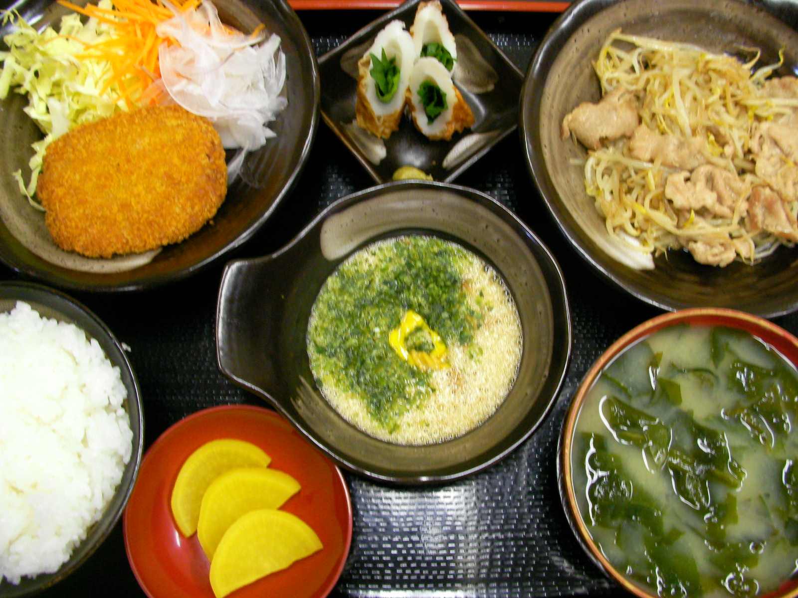 小皿でチマチマ出すと何がメインディッシュか解らん。。。。★豚とモヤシの炒めモン ★チクワの大葉詰め ★玉子とアオサの納豆 ★昔コロッケ