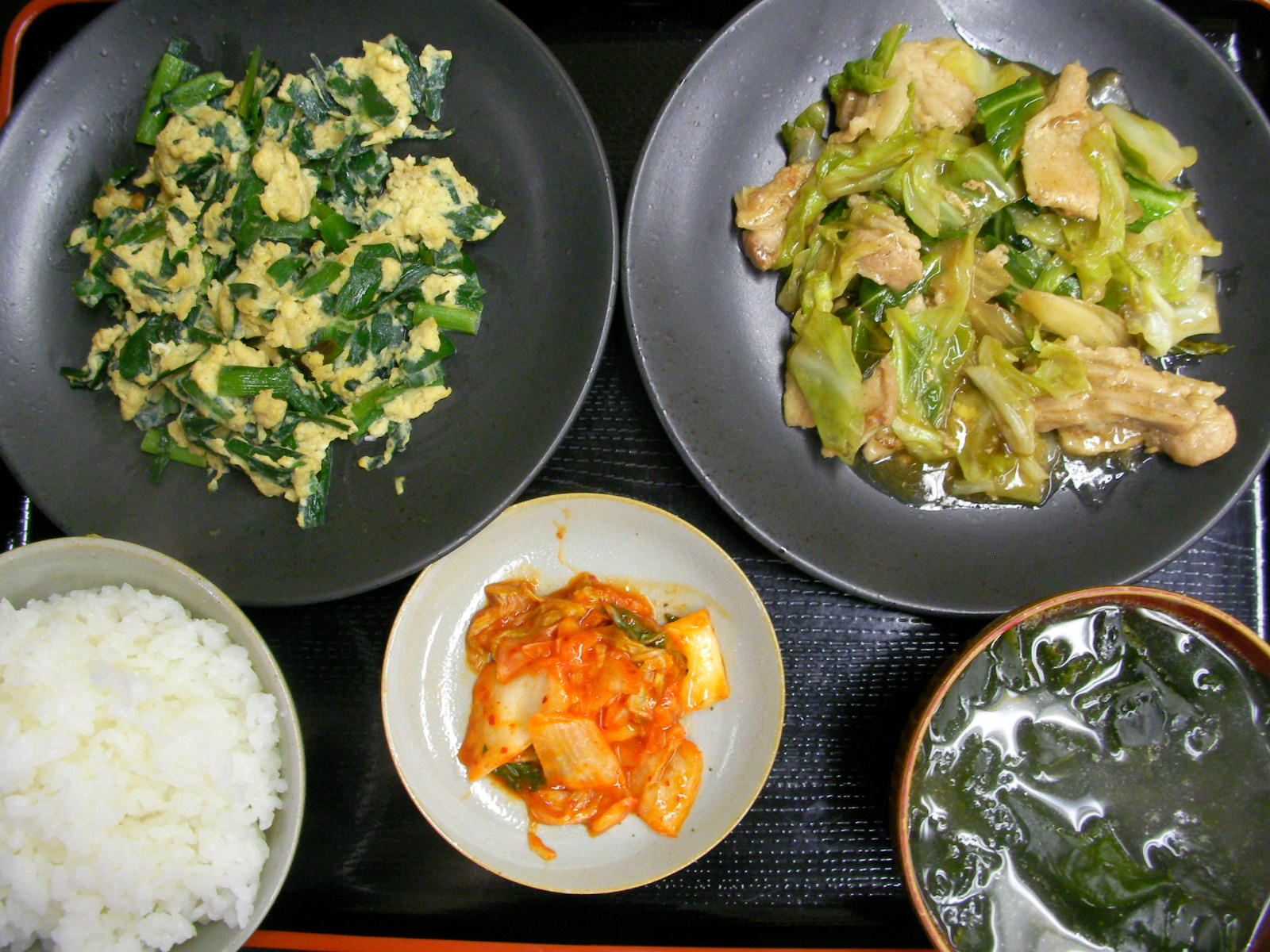 「豚バラとキャベツの炒め物」はコックリ味噌仕立てにするのだけど、オイスターソースでやってみた。やっぱり味噌仕立てにすればよかった。。イマイチどころかイマサン。。超特売と特売のコラボ「ニラ玉」 「ワカメとすりゴマのスープ」「キムチ」