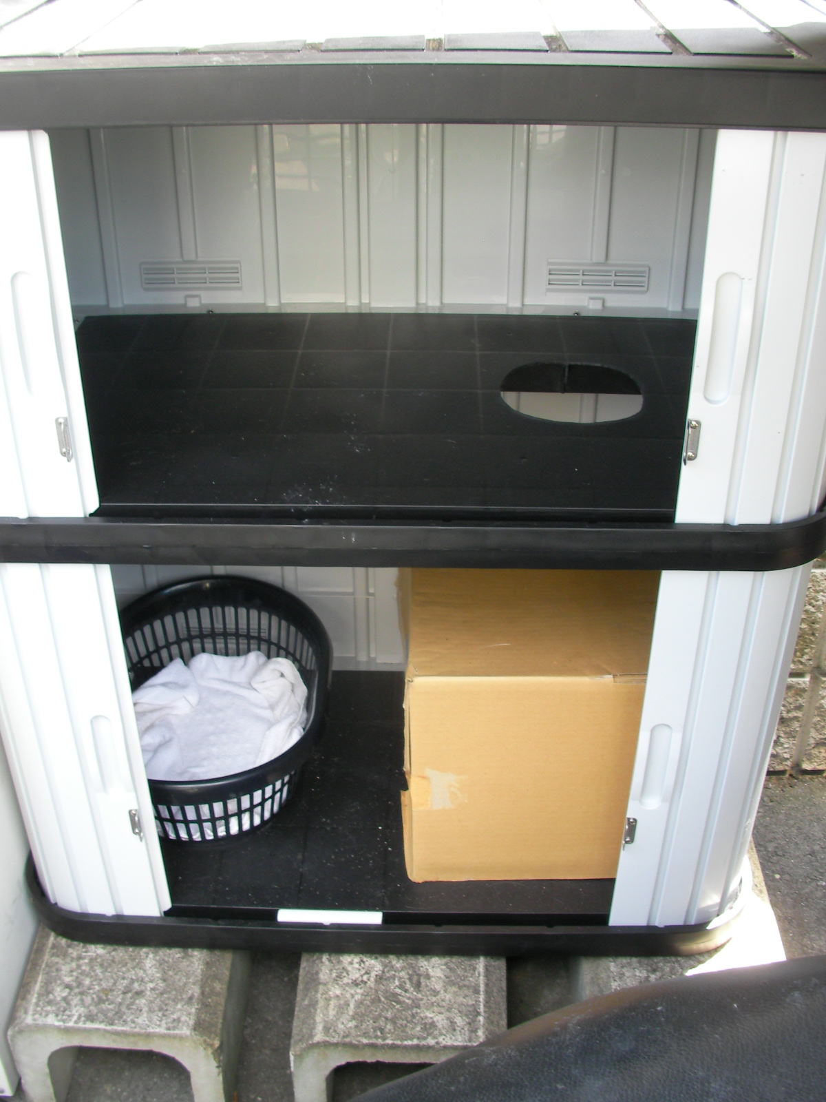 どうぶつ基金キャンペーンで無事不妊手術を終えたワァコ嬢とクロスケ君。捕獲器で捕った心理ストレスもすっかり癒えたようで毎日食事に通ってくる。ワァコ嬢に至っては殆どウチの敷地に住んでる状態。いかんせんウチには軒下というものが無い。雨風、日差しを凌ぐシェルターが必要だ。そこで画像の物置を注文(ヒゲのお小遣いでっ)した。ヒゲがサーキットへ出向いてる日に半日がかりで組立設置。1階部から2階部へ行けるよう穴を開けるのに苦労した。カッターナイフ一丁で地道な作業。勿論カット後はヤスリも掛けてるで~ 浸水しないようにU字ブロック(重い。。)で床上げして新居完成!