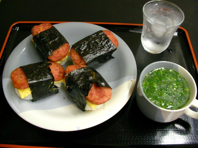 スパム。迷惑メールじゃなくて缶詰のハムね。ハワイでスパムおにぎりを食べてから髭のフェバリットになったゆえ、おにぎりの為だけに常備しておるが、しょっぱくてヤワいので母はあんまり好きでない。兎に角塩辛い。こたらモン毎日食ったら高血圧症で倒れるべ。アメリカの人々よ、気を付けなされ。。 スパムの塩分を考慮しておむすびは殆ど塩無し・挟む卵焼きも超薄味・焼き海苔を炙って撒いた「スパムおにぎり」と「刻みねぎのミソスープ」。。ってなんじゃ?てか。刻みネギどっさりの味噌汁のコトよ! マグカップに入れたからミソスープ! お椀に入れたら味噌汁!