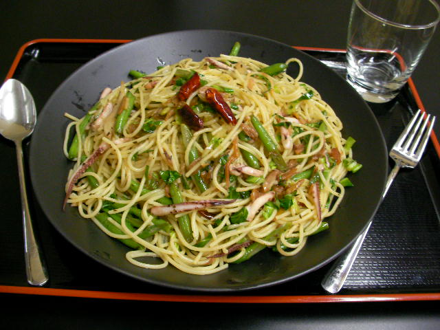 ペペロンチーノって具材を選ばんフトコロの広いヤツだ。母は春キャベツとタコのペペロンが好き。ヒゲは牡蠣と貝柱とイカのペペロンが好きだと。ただの魚介好きなオッサンじゃ。。ところでペペロンチーノの王道ってなんだろ?やっぱ、イカとピーマンかしらね? 本日は「イカゲソとインゲンとキャベツの外葉のペペロンチーノ」なんでイカゲソかつーたら胴部はイカリングフライで食っちゃったし、エンペラはイカ焼きにしちまった。ピーマンはストックしてないから冷凍インゲン使用。キャベツの外葉は捨てるに惜しく、サラダには苦いゆえ。。ニンニクの在庫はいっぱい!一番安いスタミナ食材だもん。