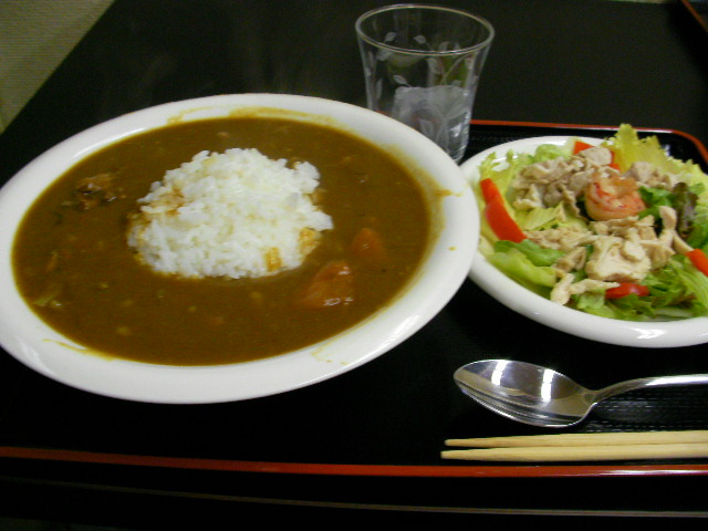 氷山の一角。。とは、よく言ったもので。。カレーの海からのぞいてる御飯は、お茶漬け用のデカ飯椀によそって伏せて山型に盛ってるんで裾野広し。「カレーライス」。 「茹で豚&茹で鶏&レタス&パプリカ&えび」のサラダはオリーブオイルとレモンと粉チーズのドレッシング御用意。配合は当然、適当。母流。