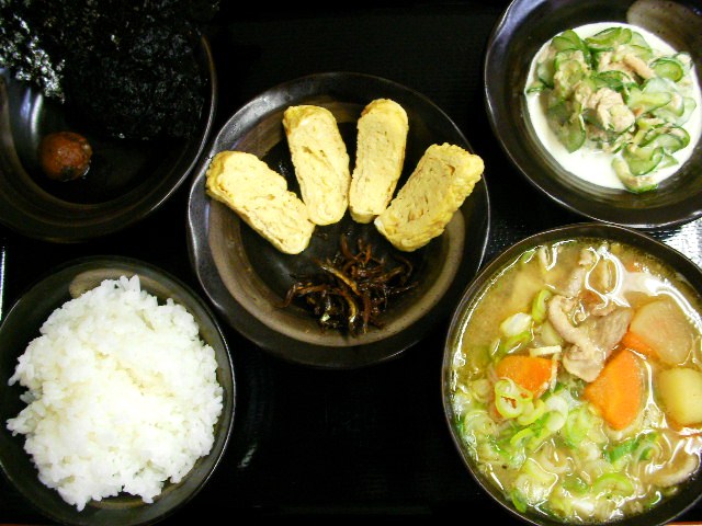 昨日のカレーは既に、しこたまニンニクを仕込んでるところにトッピングで更にガーリックパウダー風味付。暑気払いスタミナ野菜とはいえ毎日は...ね。ピラミッド作ってんじゃ無いから。。金字塔を打ち立てたいっ!て?意味ちゃうやんっ! 今日は、日本の誇る暑気払い「梅干」いっとこ。with「味付け海苔」で。と、くると「玉子焼き」しょ? 「佃煮」も要るよなー。 バランス考えて「ツナときゅうりのサラダ」でどーよ? メインは「とん汁」豚・大根・人参・ゴボウ・ジャガイモ・ネギ、具沢山。もはや煮物。。今日も野菜を沢山イヤでも食わしてガッツポーズの母なり。