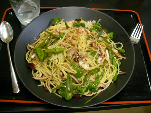 イカリングフライで胴体部は使い果たし。。 耳と足が貯まってきた。。。タイムリーにピーマン特売っペペロンを作りなさい・・と神の思し召しなれば・・ ニンニクは1人当たり1/2玉! 多過ぎ?って事もない。具材と麺の量多いもんっ 大丈夫。。本日の(^ε^)-cyu!!はお控え下さいますよう。。 赤チンチン(唐辛子)は1人当たり5本!? コレはちと多いか。。大人ばっかなんで許容。。タバスコ要らずでよろし。