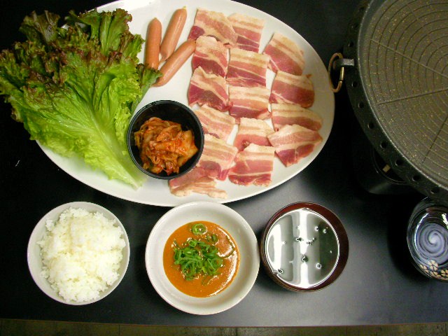 サムギョッサル。最近流行ってるみたいだけど、ABSでは10数年前から定番。ある年にヤロースタッフのみで韓国旅行に行きおって、旅土産話のひとつにサムギョッサルたら食い物がスンゲェ旨かったと申す。どのような代物か?と訊ねたら各々口々。。定まらんっ豚肉であることしか解らんっ 母は食した物は「モドキ」を作れるが聞いただけでは。。で、翌年、釜山で食ってきた。タレがミソやね。(マジ味噌使う)コチュジャンと合せ味噌・etc混ぜこぜたら、それっぽくなった。以来ランチに登用しばしば。当時は豚バラ厚目スライスは売って無かった名残で未だに塊をカット。 各自で焼いて食ってくれるんで手間が減って母はチョイ楽。皆も食った気がするらしいので出番増やすか。