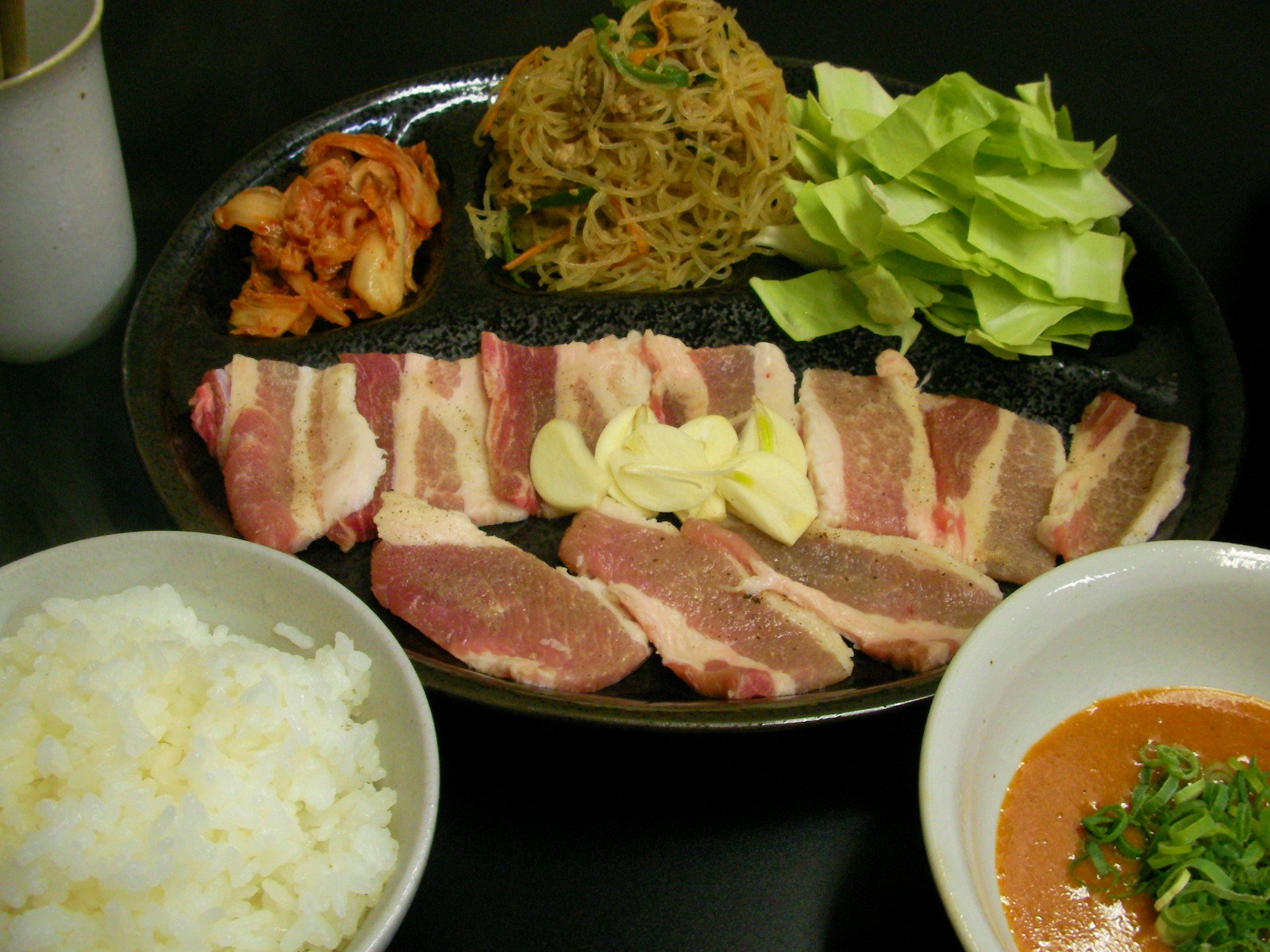 チャプチュかチャプチェか呼称が可愛いんでどっちでもイイ。韓国ハルサメ料理ね。の、モドキがメインなランチどす。なんでモドキかつーたら焼肉屋サンで食べた記憶で再現だから。。めっちゃハマって焼肉食わずにお代わりしたもんねー シイタケやらも入ってたような・・だけど今日のは牛コマと人参とピーマンで。 付け合せはどーする? 先日サムギョッサルがバリ受けしてたんで「豚バラ焼き」いっとこぉ 相性大事だし。。「キャベツざく&キムチ」は焼くなり生なり好きに。。スープ作るの邪魔くさいんで「ホットウーロン茶」でごまかす。