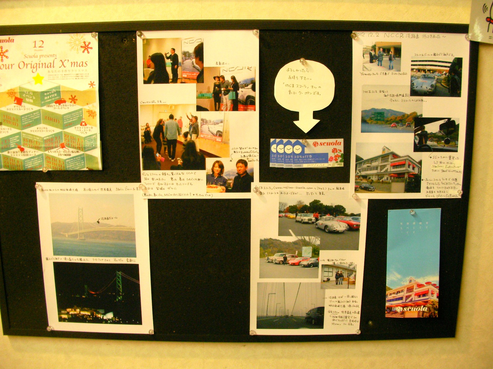 12・2に開催されたNCCR・Tour de Awajiに参加させて頂きまして。 景色の良いルート(淡路島の海沿い)をドライブさせて貰いーの、観光スポット(大鳴門橋記念館)でランチを頂きーの、お洒落なカフェ(のじまスコーラ)でお茶しーの、、ゴールでスタートの舞子ヴィラ神戸ではヴュッフェスタイルの夕食&表彰式&じゃんけんぽん大会。。 至れり尽くせり盛り沢山なイベント! クルマのイベントはサーキットのレースイベントしか知らぬ母。。夏は暑くて冬は寒くて朝は早いで眠たくて...な過酷さはゼロ。 是非皆様、ご参加くださいっ ファミリーでエントリーお薦めどす。 お客様ルームにスナップ写真数点掲示してますんで見てちょ ところで先先日のユーロ5戦のスナップもアップしてますけん、トップ>レースをぽちってね~