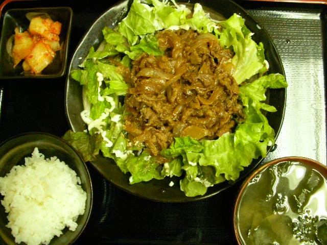 「喫茶店的焼肉定食」とでも命名すべか。 薄切り牛肉とタマネギを焼肉のタレ炒めた超お手軽メニュー。でも御飯のススム一品である事は言わずものがな。。。焼肉のタレ万歳!\(^^@)/