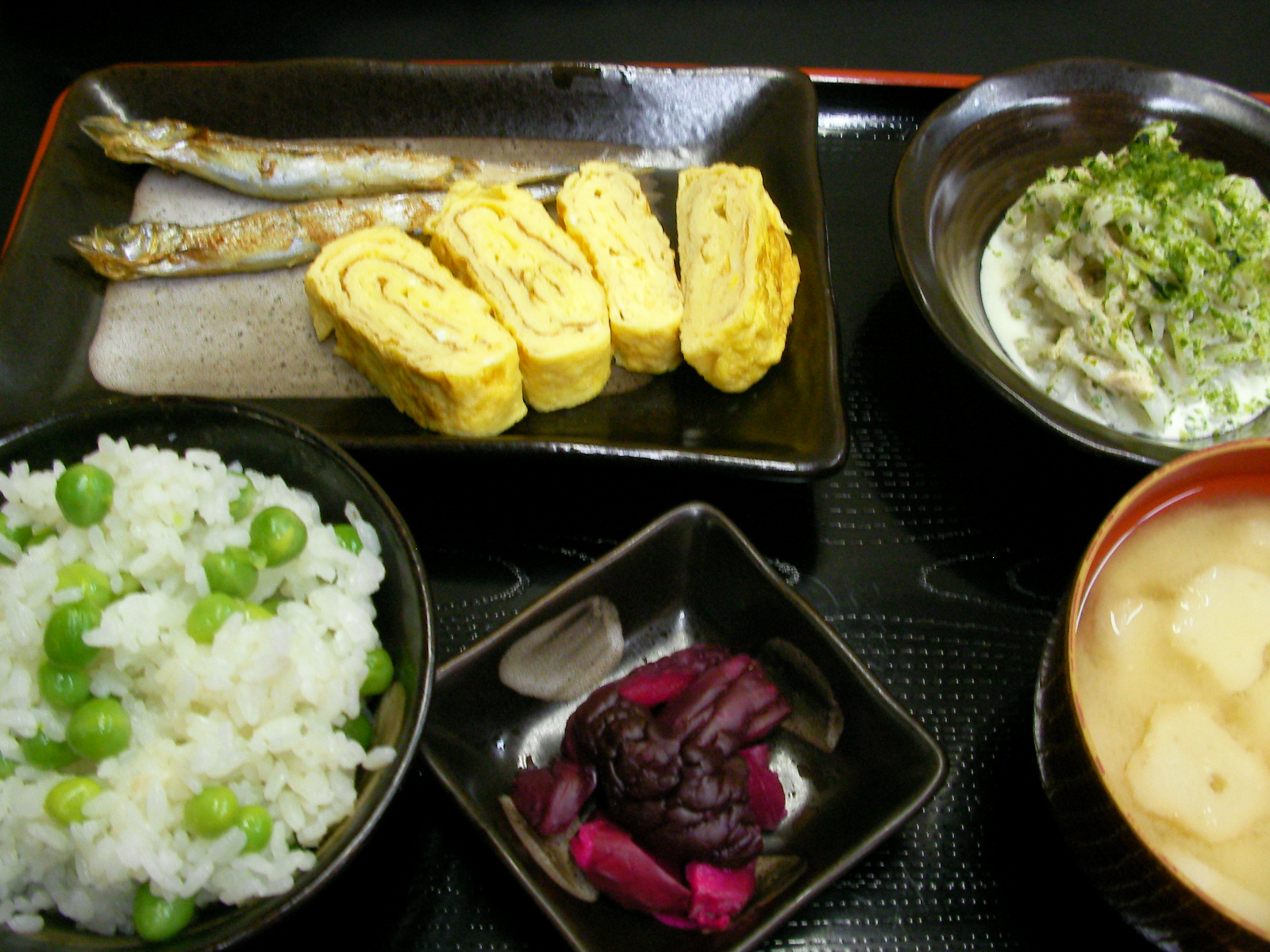 メインは「豆ごはん」! 晩春?初夏?どっちでもエエわ、コレ食べんと季節感じねぇのは母だけちゃうやんなー? えんどう豆はサヤごと採れたてをFルヤ氏に頂戴した。Fルヤ氏つーたら釣りプロやねんけど。。菜園もやっとるのねー。出来はご立派で1サヤに大きめ10粒オーバーなんだから凄げぇ~ お豆の緑色に合うのは黄色い「玉子焼き」っしょ。 黄色かぶりは無粋なんで沢庵やめて「柴漬け」で彩りに拘ったゾ。 「ししゃも」は数日前出番のストックね。 あっさり系なんで昆布出汁の「麩の味噌汁」 胃薬効果期待して「ツナと大根のマヨ和え」