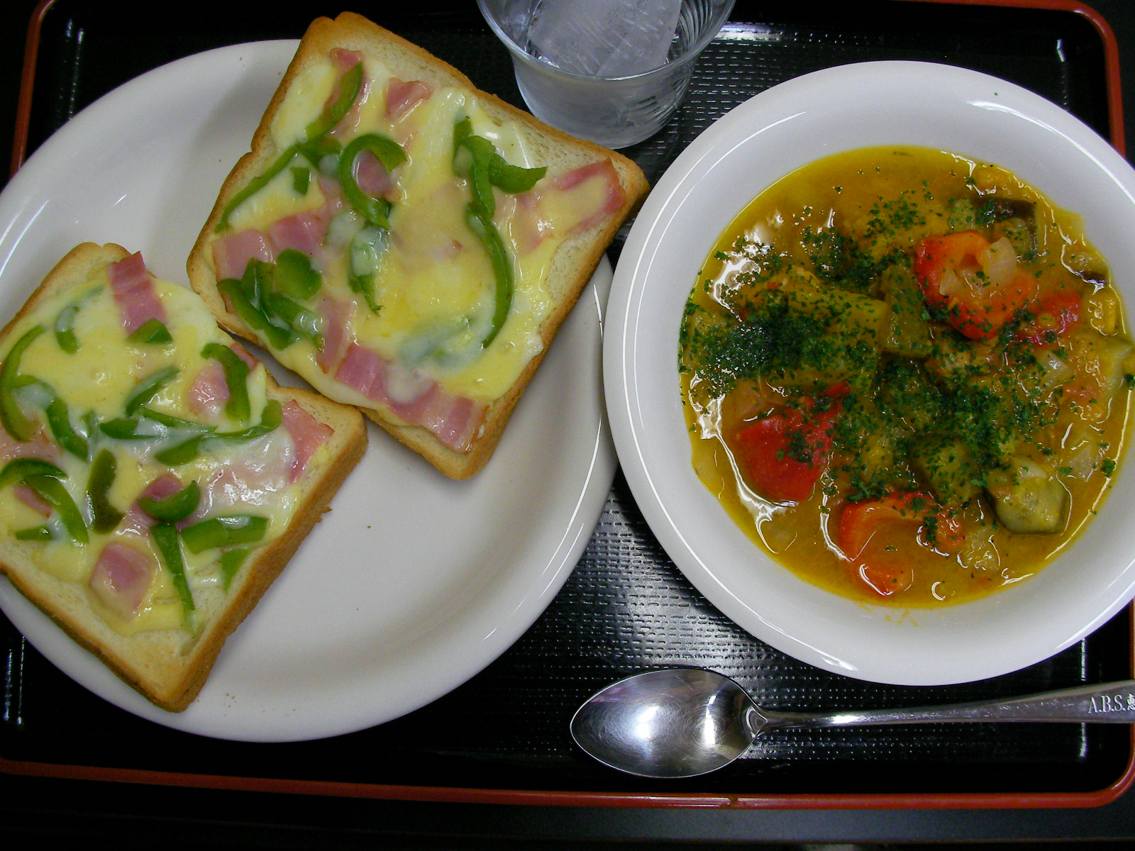 N島サンご夫妻がラタトゥイユをお鍋ごと差し入れ下さった。野菜がブっ飛び高騰中なおり有り難き。 カリカリに炙ったバケット(&ワイン)なんぞ合わせたいところだけど、ヤローどもの午後の仕事量には、ボリューム不足懸念。。ベーコンとピーマンのチーズトースト添えてどーだ? 御蔭様でバランスばっちりなランチが完成しましたw。 ご馳走様でした~。