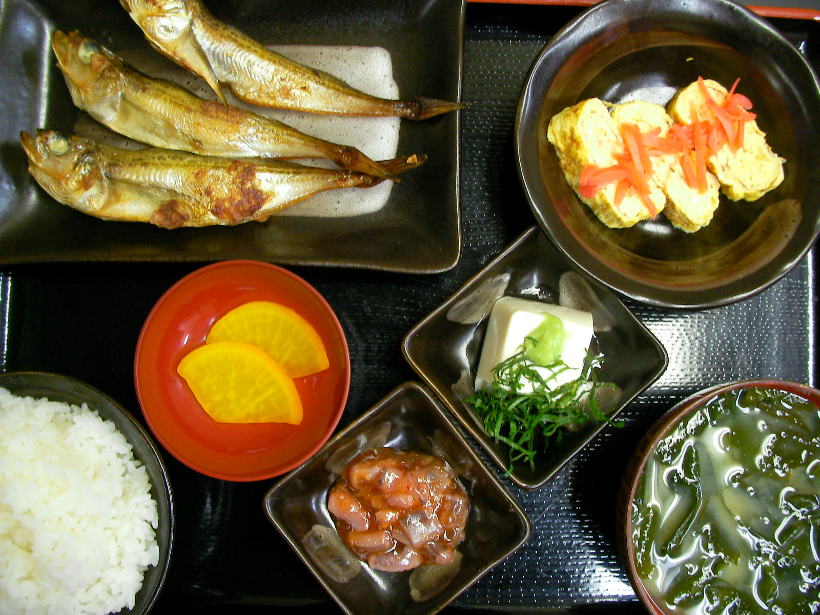 Wかチャンさんに頂いたハタハタがメインのランチ。「炙りハタハタ」脂がのってて旨いっ 大きさも丁度イイ。コレ以上デカいと骨が当って丸ごといただけないもんね~ 魚大好き髭の皿は当然、盛り付け忘れたか?と勘違いするほど骨1本、カシラも無しの空っぽ完食! ったく、野良猫以上だw 母も魚は上手に食べるけどカシラは残る。そのカシラまで食っちまう髭は、やっぱ野良猫越え。。だ。 「玉子焼き」。 「冷奴」はトロトロ絹なんで大葉とワサビでツルっと。 「タコの塩辛」はHメカの、ハタハタと同じく竹野土産なんでコラボってみた。で、竹野定食。。