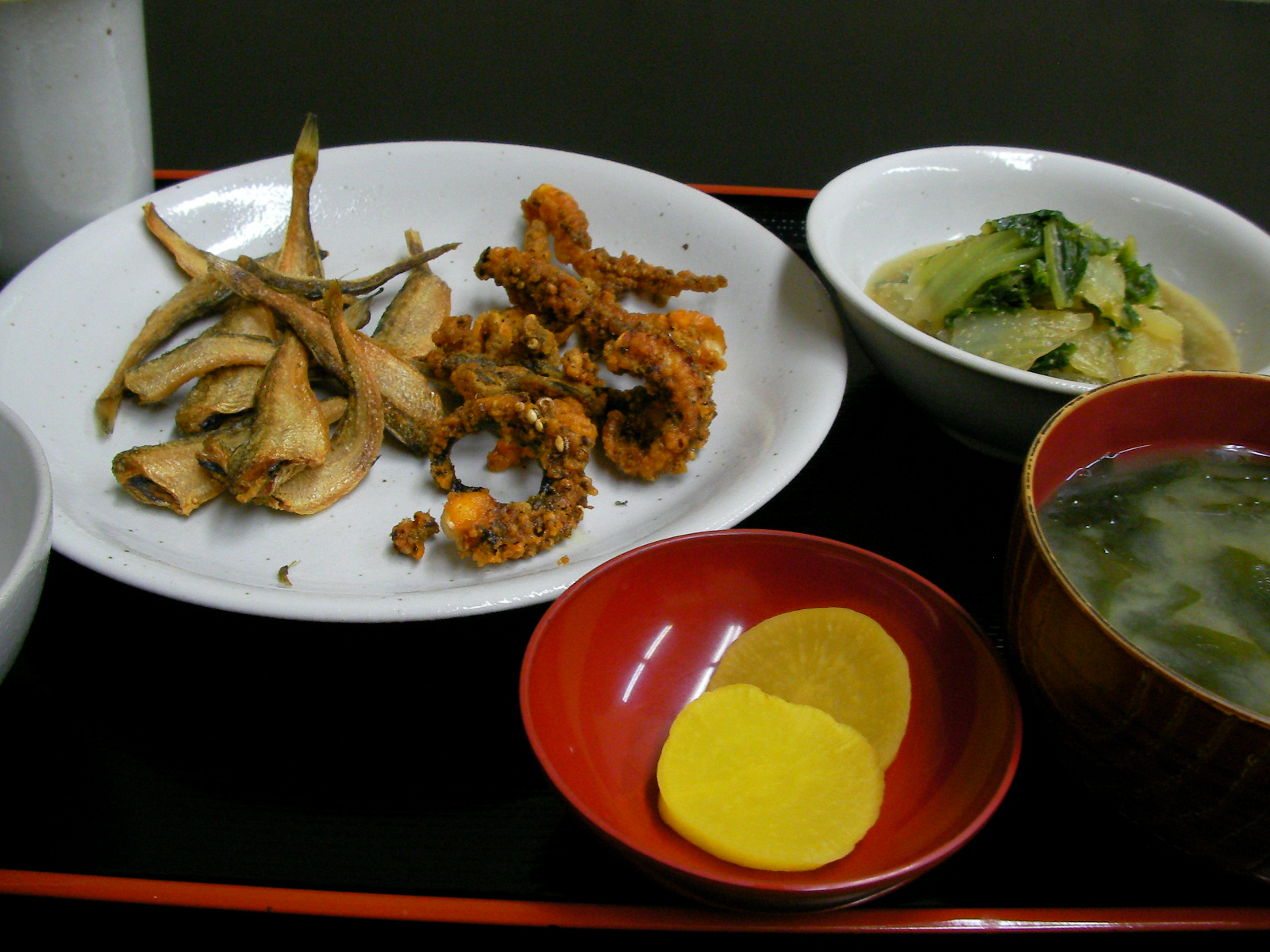 ちびっこハタハタも同梱してくれたんで「唐揚げ」で頂く。ハタハタのチビも初めて。頭も取ってあって揚げるだけの手間要らずで旨いっ 「ゲソ天添え」 貴重な白菜は、まんず、、外葉を料理。 炒めて>「煮浸し」一人当たり豪勢に10枚も使ったのにーーー 野菜は火入れたら>しおしおのぱー
