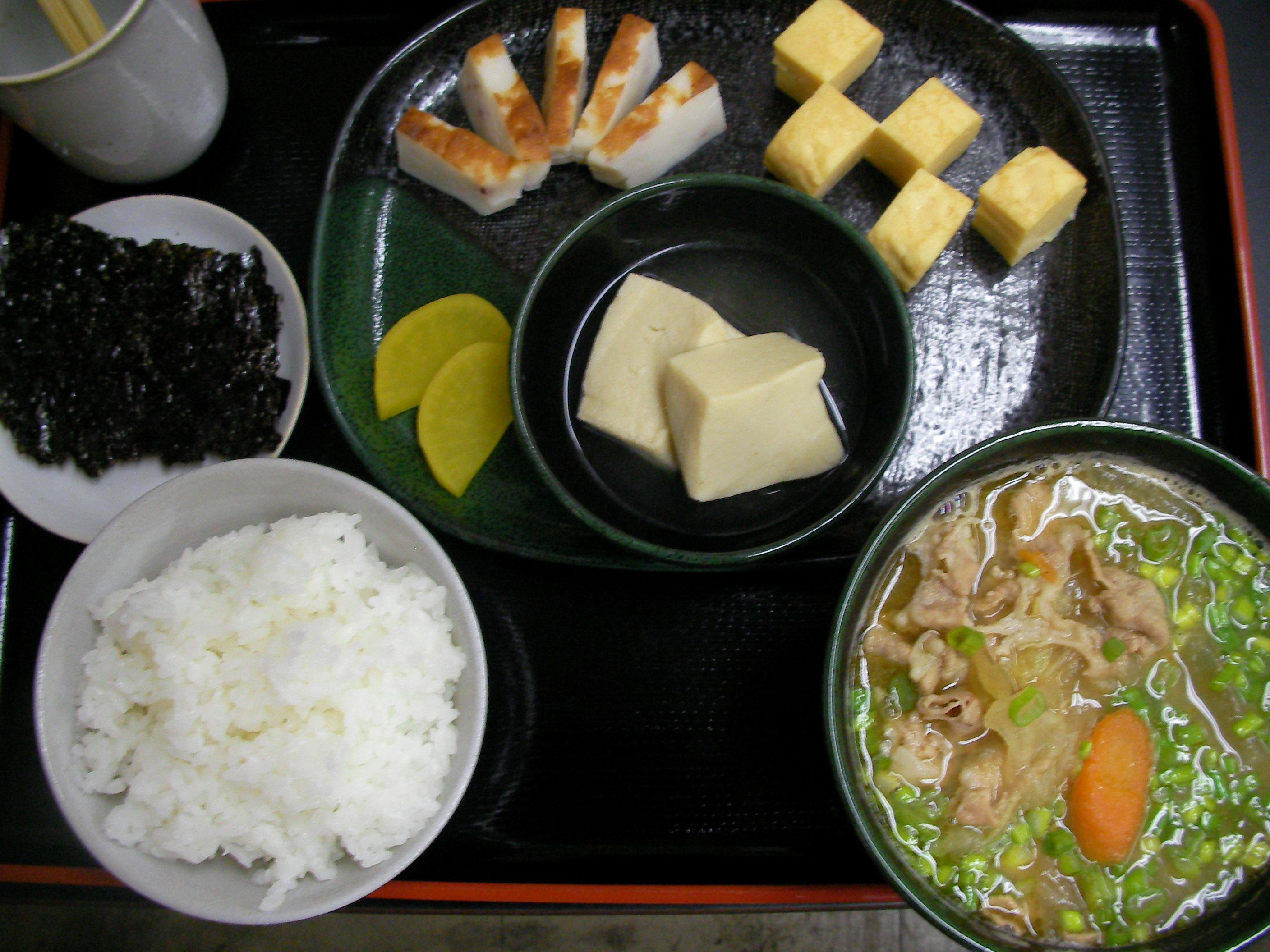 画像にしたらエッジのきいたおかずで笑てもた~ ・出汁巻き玉子・たこカンボコ・高野豆腐・味付海苔・豚汁 お皿に野菜が無い? 大丈夫。豚汁に色々ドッサリ。