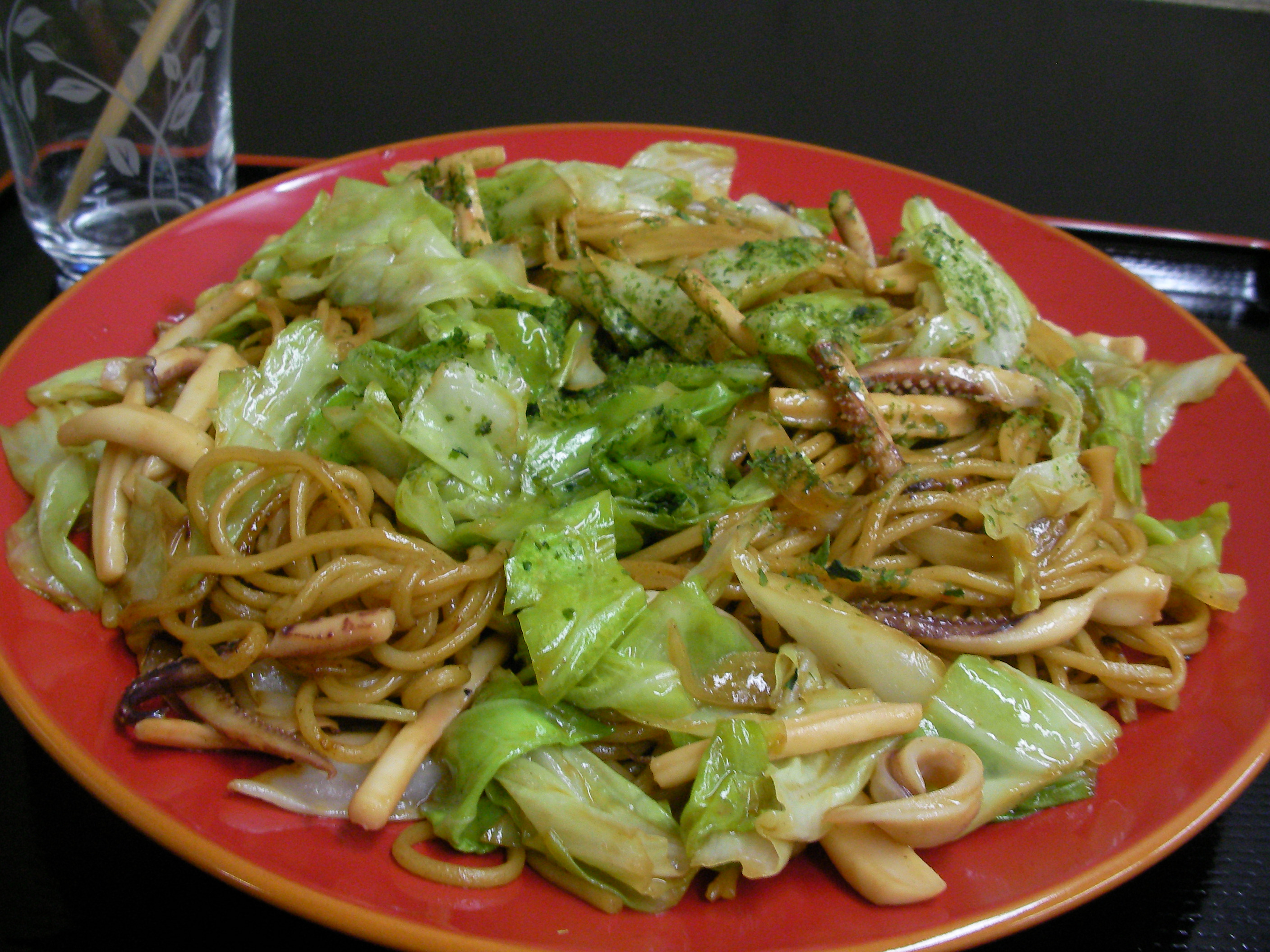 オヤツなら1玉2玉でいいでしょうけど、労働者!の昼飯なんでトリプルぅ~3玉仕様だぜ。キャベツもどっさり「イカ焼きそば」