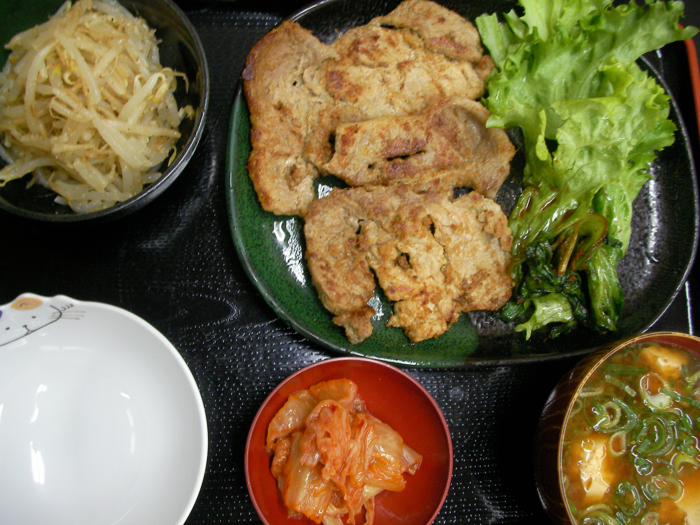 ゴマ油使っただけでコリア風を語るな!的な「豚ロースのニンニク塗し焼」&「もやしナムルもどき」。 でもねっでもねっ 「豆腐とネギの味噌汁」 の味噌は韓国のなんとか味噌を使ってるねん!